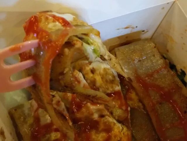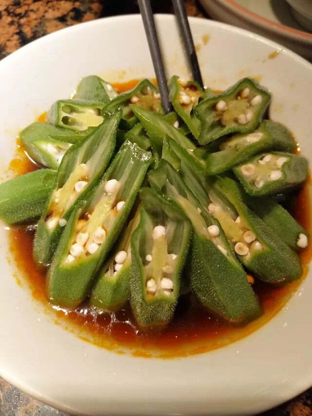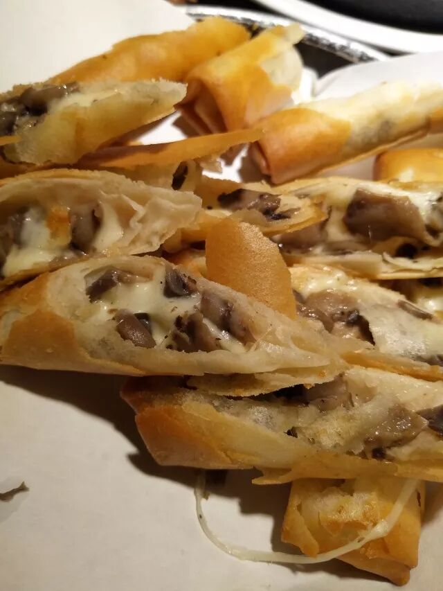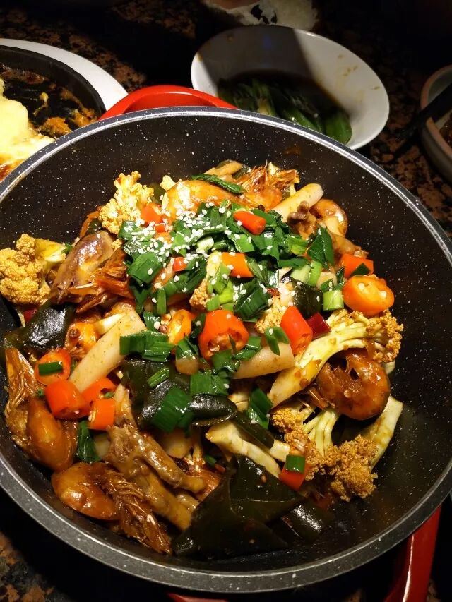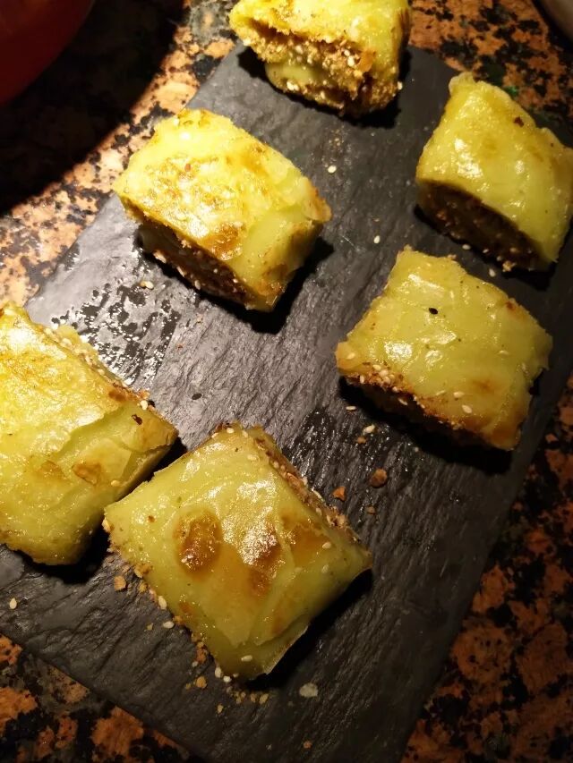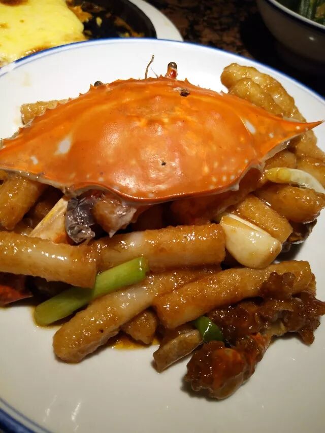 梭子蟹炒年糕,性价比之王。19/盘。柱状年糕事先炸过,和蟹腿酱炒,年糕Q弹,酱味足。糖煎麻糍,略有逊色,油煎过,略油,麻糍相较于年糕,软粘了些,好在夹心的花生碎加了不少分,一下子吃了两个也就很够了。鲜蘑芝士卷,春卷皮,蘑菇➕芝士的馅,可以想象的味道。还有一个排版与众不同的鸡爪煲,鸡爪和虾藏在素菜之下,成了我和伦爸,218和220,的对决,我,险胜。