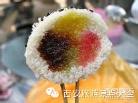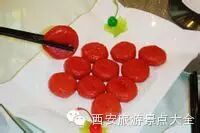 镜糕是陕西的传统小吃,是以糯米为原料蒸制而成的形状似圆镜的糕。口味有玫瑰的、草莓的、哈密瓜的、巧克力的等多种,蘸上果仁碎和葡萄干,吃起来十分香甜。