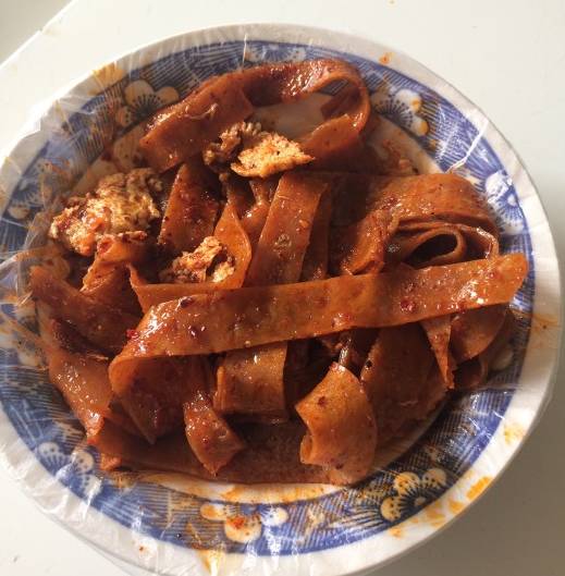 有一种更加小众面皮叫黑面皮,吃过的人恐怕不多。黑面皮以荞面为原料,不是擀出来的,而是烙出来的,类似煎饼,是烙面皮的一种,但是口感一点也不硬,而且柔柔的,有股淡淡的荞麦香味。