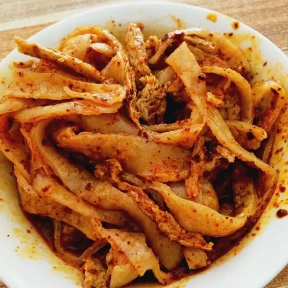 很多人会混淆凉皮的概念,陕西凉皮指小麦面洗过面筋后的面水,再蒸出的面皮叫凉皮。陕西的风味小吃中,“凉皮”是最受欢迎的品种之一,一年四季有卖,男女老少都爱吃,尤其受年轻姑娘的喜爱。陕西的每个城镇,乃至乡村,到处都有卖凉皮的。