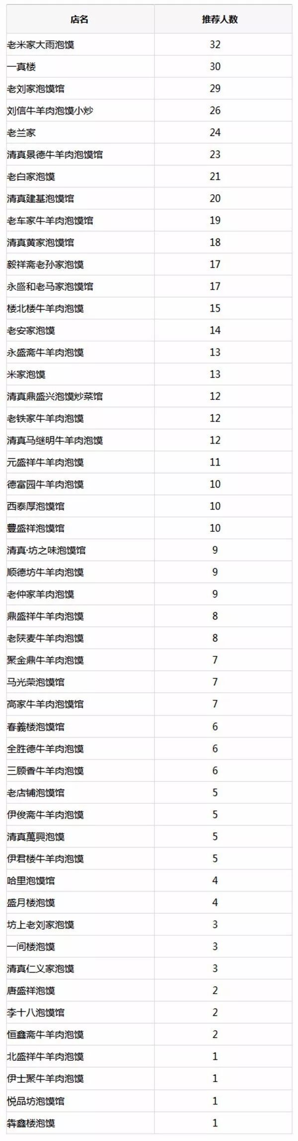 加班到十点,无数次想撂挑子,不过为了工资只能安慰自己“我爱工作,工作使我快乐。”保持微笑继续整理,最终统计出,共有537位资深吃货推荐了自己最喜欢的泡馍店。老米家,老刘家,老兰家,老铁家......各种家;一真楼,一间楼,楼北楼,伊君楼......各种楼。