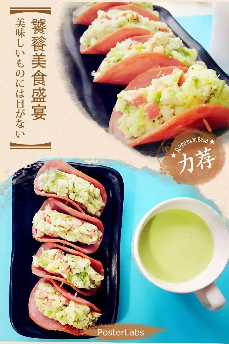 原料:火腿片,牛油果,火腿肠,土豆泥,盐,黑胡椒粉