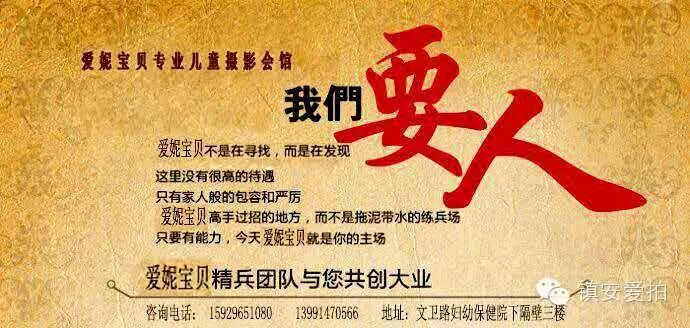 爱妮宝贝专业儿童摄影会馆入驻镇安,是一家专业,时尚, 奢华,于一身的专业儿童摄影会馆!因业务需求对外诚招, 化妆市助力5名, 摄影师助力5名, 导购10名, 任职要求: 1.为人热情,性格开朗,具有良好的沟通能力和表达能力; 2.具有良好的销售技巧和销售经验,能与家长进行良好的沟通; 3.有良好的服务意识和吃苦精神,能处理客户纠纷; 薪资 1500~3000元