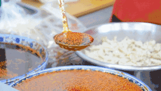 面条在开水中煮熟后捞在碗里,将葱花碎、花椒粉、盐等配料,和厚厚一层的辣椒面一起铺在上面,用滚烫的热油浇至而上,伴随着呲呲的声音,搅拌片刻,辣油均匀的裹在每一根面条上,这绝对是对味蕾的挑衅~
