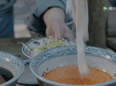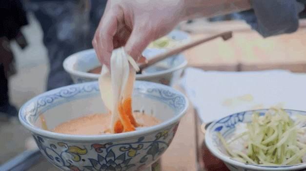 后面到了集市上,就是凉皮的镜头。大刀切凉皮,霸气得很有木有!?不是所有的地方都这么切吧~特别是师傅拿着凉皮往红油里一蘸的时候,周莹的眼睛都看直了!