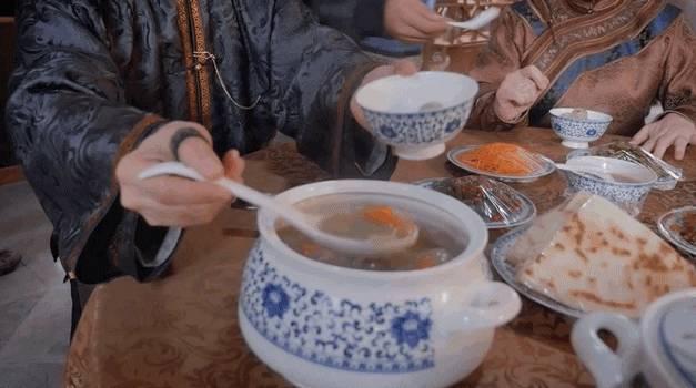 除了周莹,吴家老爷也是地道陕西美味代言人。吴老爷一边跟人说话,一边吃的应该就是陕西传统坊间小吃“油茶麻花”。吴老爷的日常早餐就是油茶泡麻花,一边细细掰着麻花,泡进碗里,一边听着下人回报工作,惬意得很~