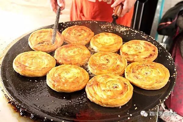 “魁”字在词典里的解释是:为首、高大。跟糖油果子、三大炮、叶儿粑、汤圆等四川小吃相比,锅魁的个头确实称得上是魁首。四川锅魁跟北方锅盔的做法不同,品种变化也更多。按做法来分,有白面锅魁、混糖锅魁、酥皮锅魁等;按口味来分,则有红糖锅魁、椒盐锅魁、鲜肉锅魁、葱油锅魁、牛肉锅魁等。在众多品种当中,又以军屯酥皮锅魁稳居“魁首”。