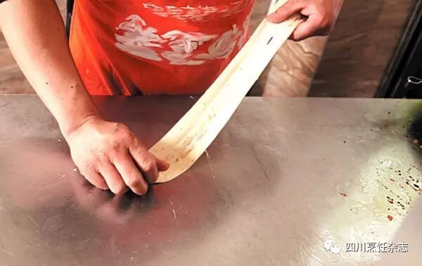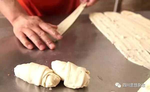 其次是擀面,把揉好的面团搓成长条,摘成每个重约100克的剂子,再用擀面杖将其擀成长而薄的“牛舌片”。在抹上一层猪板油泥后,卷成卷,压成饼状再擀成长薄片。四川人之所以把做锅魁称为“打”锅魁,关键就在于一定要发出声响,以此制造气氛来招徕客人。所以擀面时,左手捏住面剂,右手执擀面杖,一边擀,一边急促地在案板上敲打,随后捏着擀薄的面片在擀面杖上快速绕一圈,向内一翻,“砰”的一声摔在案板上,整个动作需一气呵成(见下图2~5)。