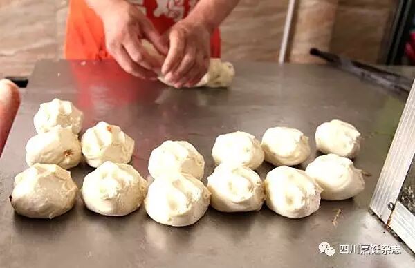 第三步是加馅。鲜肉馅是将五花肉绞成泥,加精盐、味精、鸡精和花椒面和匀而成的;牛肉馅是把精牛肉剁碎,加豆瓣、姜米、花椒等调成的。把馅心抹在面片上,卷成卷,稍压再擀成较厚的圆饼状,表面可粘上黑芝麻或白芝麻,以区分不同的馅心(见下图6)。
