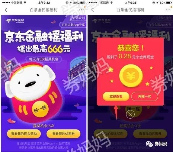 每人每天可摇3次,邮寄获得0.18/0.11/0.08/666元现金红包,白条支付券,话费充值券,金币2个等奖品。奖品数量有限,先到先得;