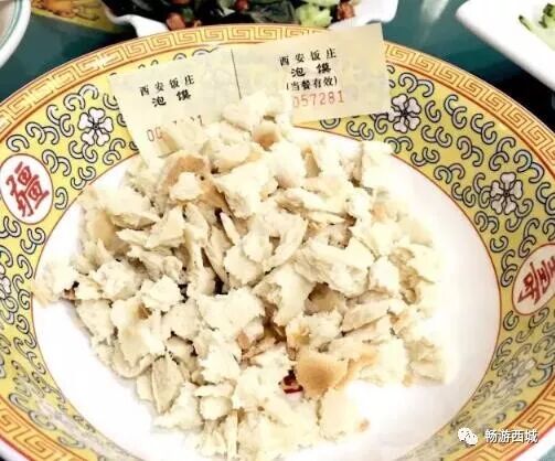 在老西安饭庄,羊肉泡馍分为精品泡馍和普通羊肉泡馍两种,每份泡馍都配有辣酱椒、糖蒜、香菜,精品泡馍还多一些黄瓜条。老西安饭庄的独特之处就在于,他家的泡馍要自己亲手动手!