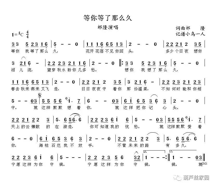 等你我等了那么久,花开花落不见你回头。多少个日夜想你泪儿流,望穿秋水盼你几多愁。想你我想了那么久,春去秋来燕来又飞走,日日夜夜守着你那份温柔。八孔葫芦丝《等你等了那么久》音频