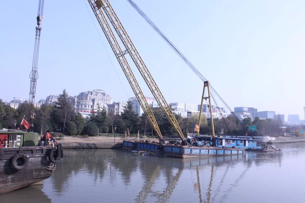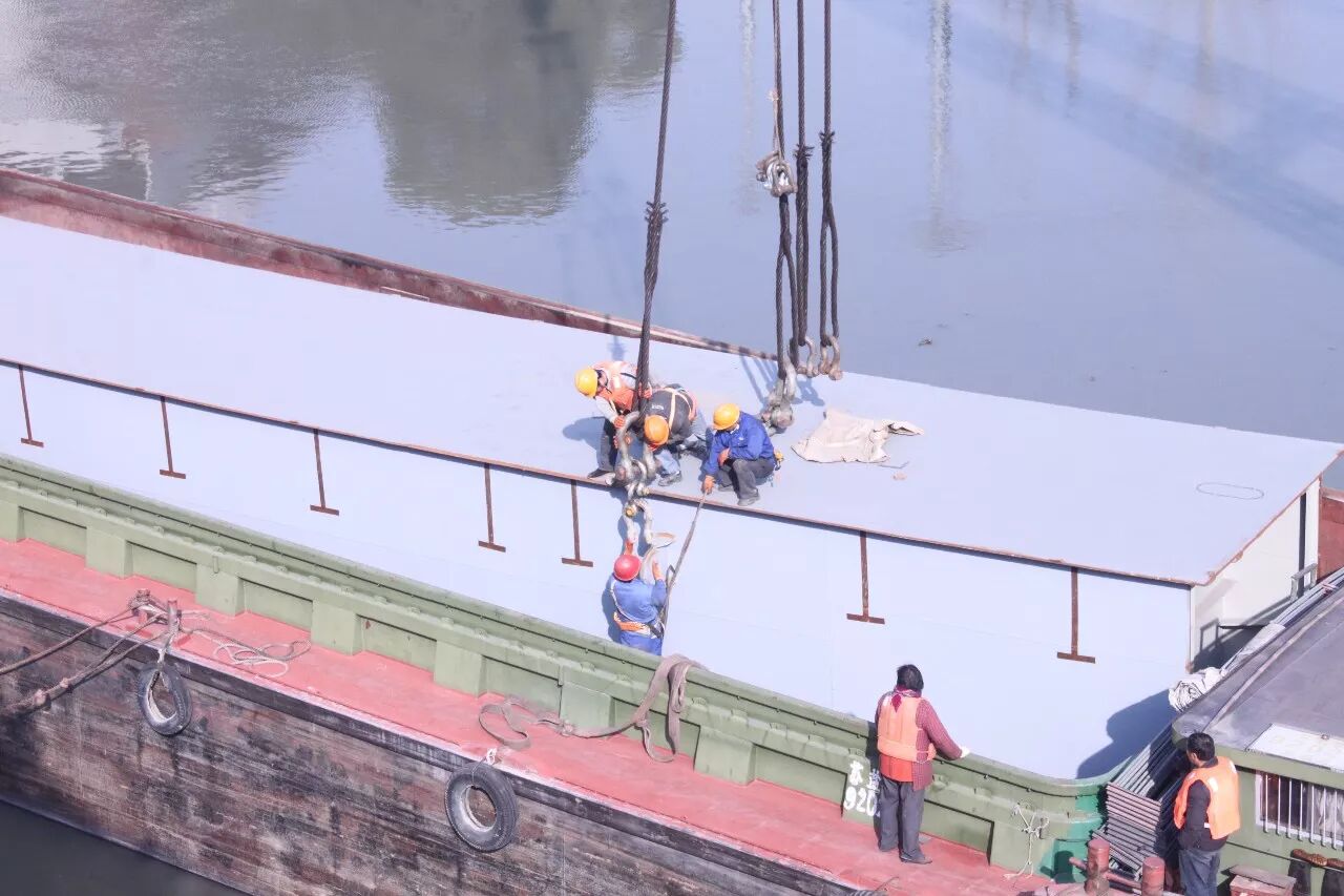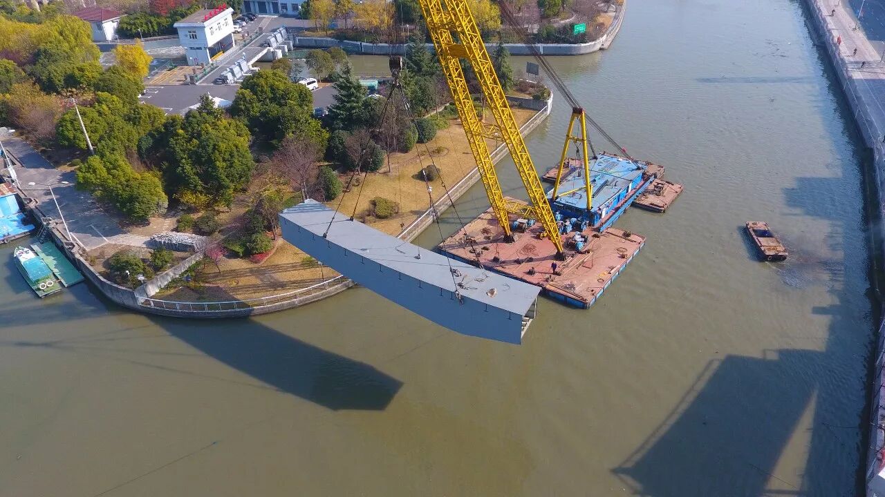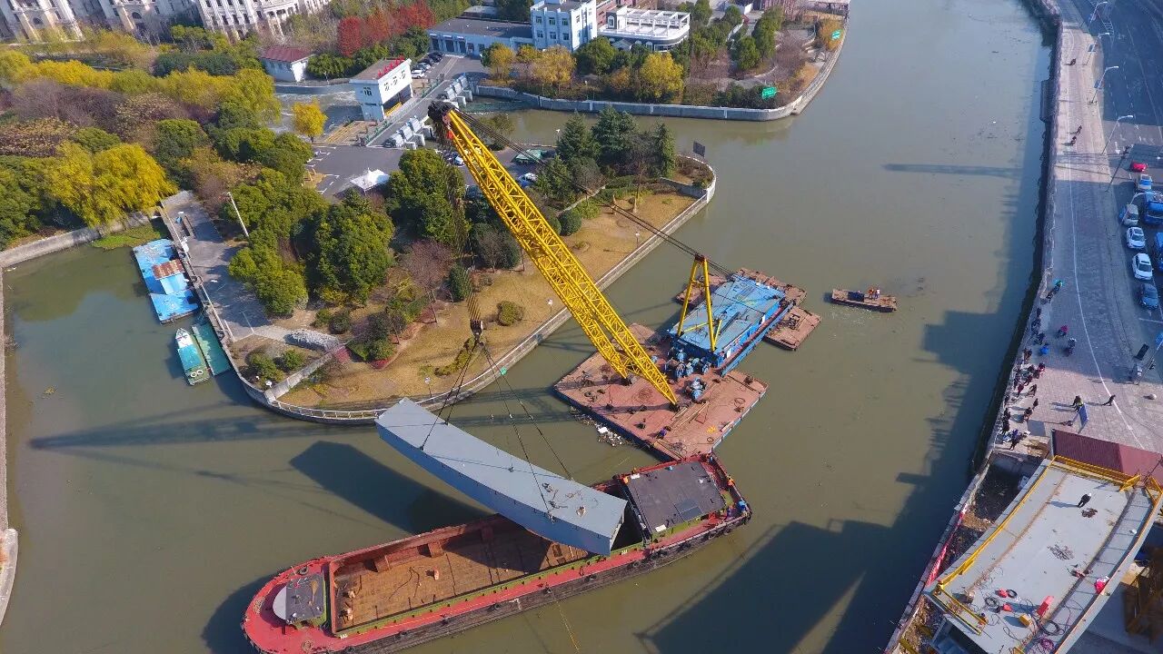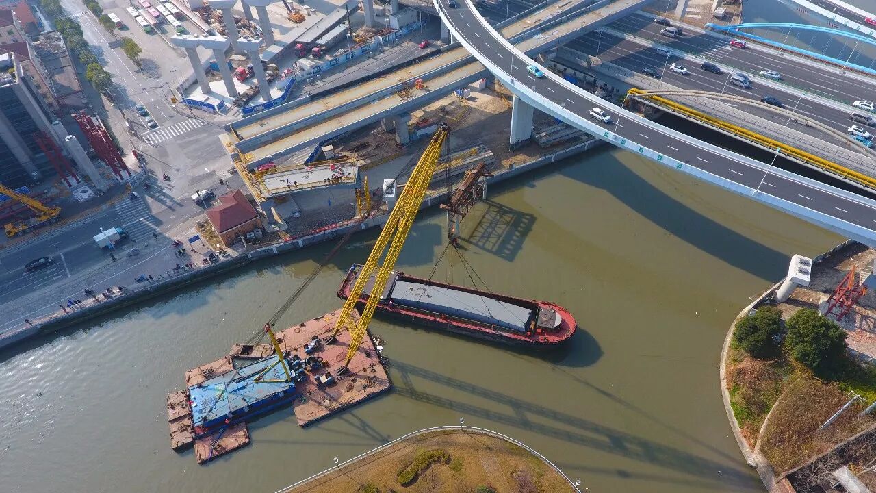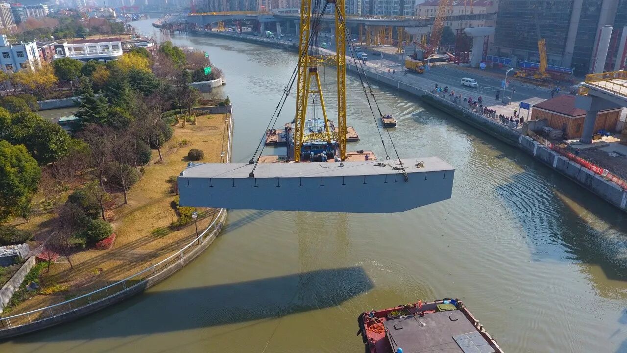 2017年12月25日上午8时,一艘运输船和一艘起重船缓缓驶入苏州河施工区域准备进行浮吊作业,本次要安装的钢箱梁长26米,宽和高各4.1米,重约95吨,是跨苏州河长度最长的一段。