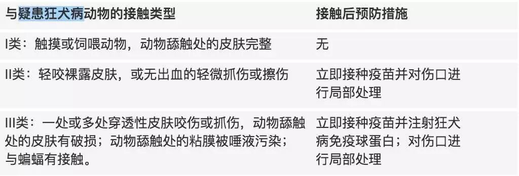 重型:一处或多处穿透性皮肤咬伤或抓伤,或者动物舔触处的皮肤有破损;动物舔触处的粘膜被唾液污染;与蝙蝠有接触——立即接种疫苗并注射狂犬病免疫球蛋白