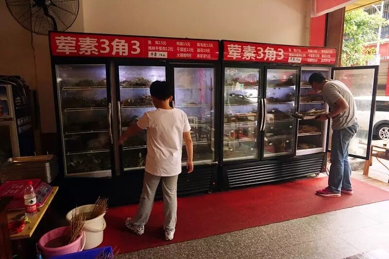 还有去火锅店必点的鸭肠,在盖帮可是热销菜之一呀。菜市场有定点供货摊位,每天新鲜的很,你吃到的鸭子很可能几小时前都还在笼子里活蹦乱跳的。看嘛看嘛,今天卖的好,老板火急火燎又去补货了。