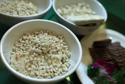 羊肉泡馍并非一般的将馍泡入羊肉汤来吃,而把“饦饦馍”(一种特质的馍,九分发面一分死面)掰成碎块。