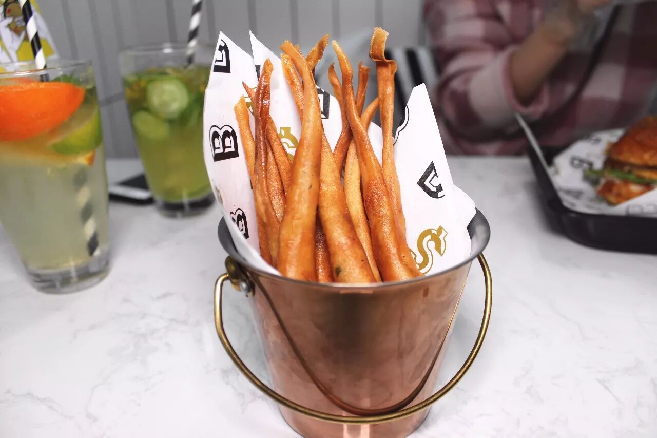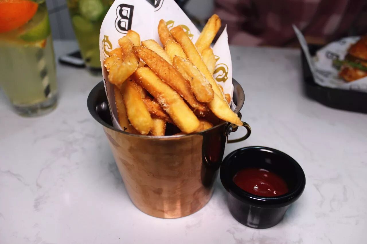 薯条上撒了芝士粉,很适量、不会腻,配上手工调制的蘸酱,吃起来很香,口感很酥脆,很赶劲儿!其实好的薯条需要太多条件配合,从选择薯条、保存温度、油的选择、机器设备等都会影响薯条的最终出品。这酥脆的口感,是精确时间和油温控制的精妙结果。