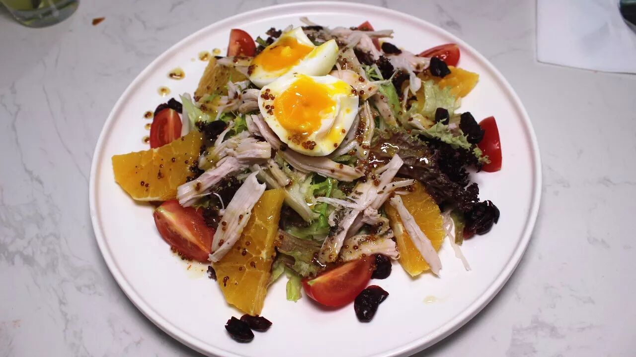 以混合蔬叶为主,加入煎熟的鸡肉,淋上自制的蜂蜜黄芥汁,口感清爽。