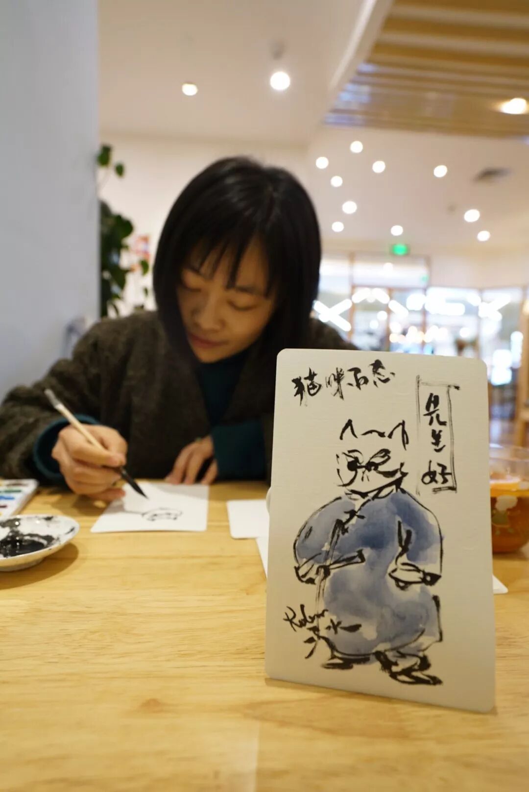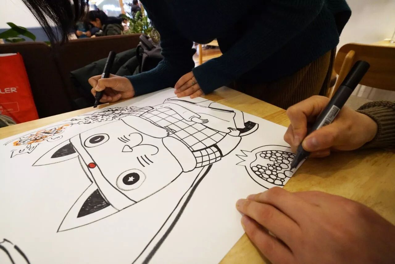 在活动开始之前,两位作者需要为现场粉丝准备手绘明信片,同时为猫空西安店绘制一幅猫咪主题作品作为留念。两位作者截然不同的风格,形成了鲜明的对比,而这也是《猫咪百态》这本书的特色所在,包容不同创意、不统计法,呈现绘画创作的无限可能。