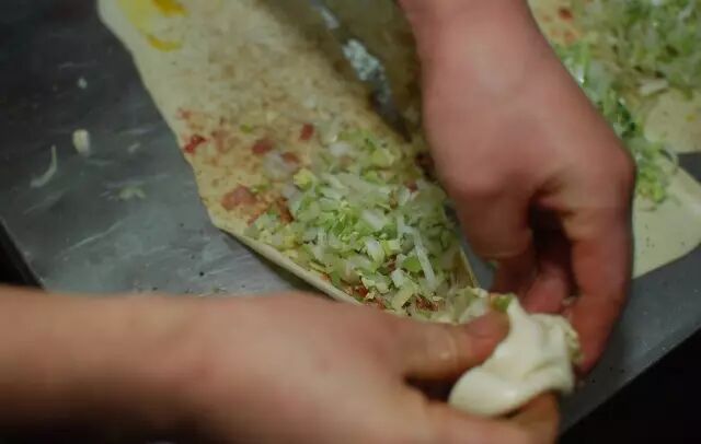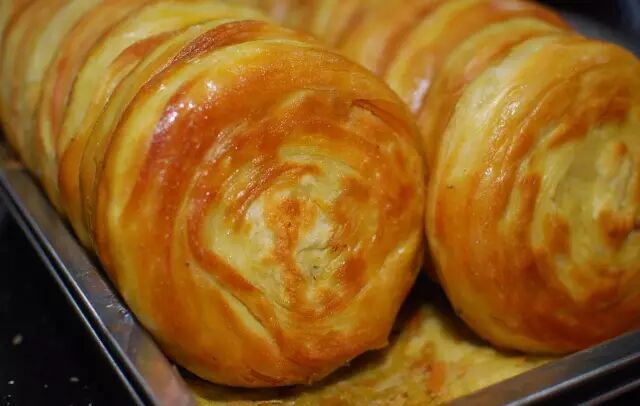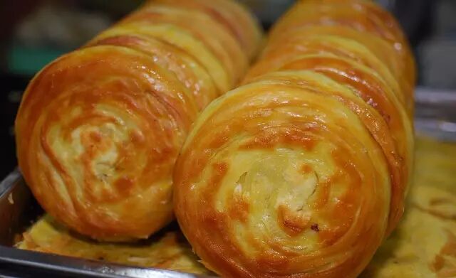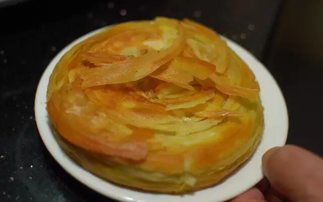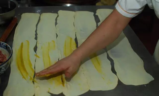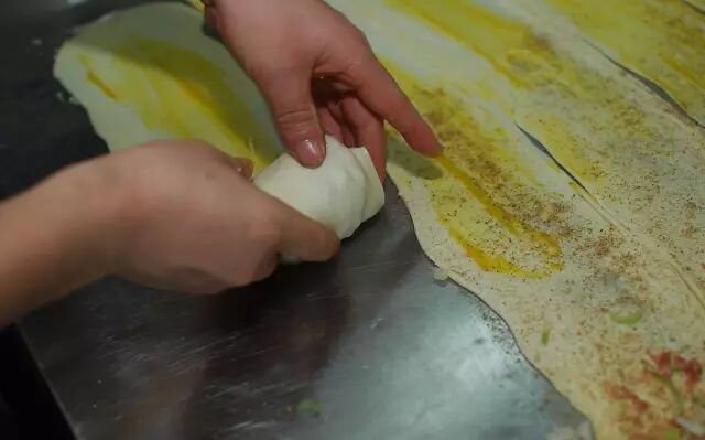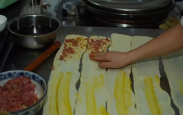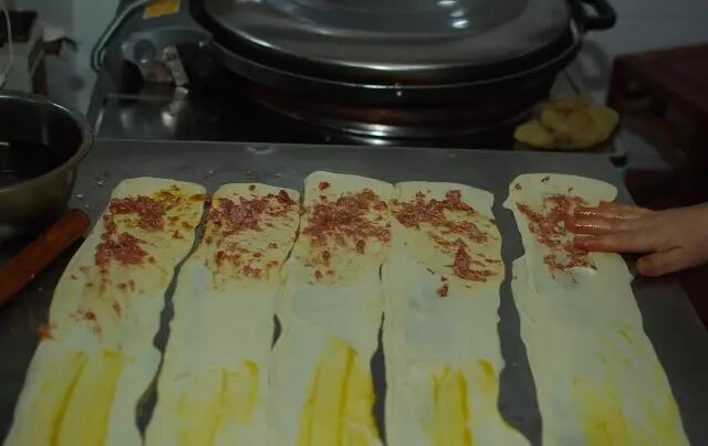 看这厨师做的最后一锅,面团擀开,抹上牛油,这样饼子比较酥脆