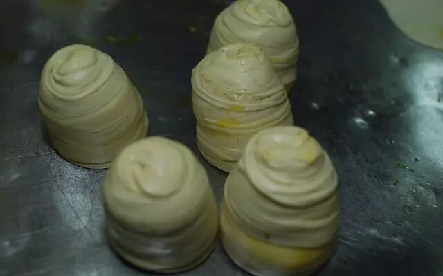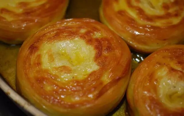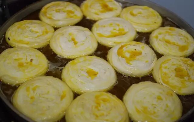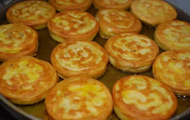 一锅能做十几个,这样卷好的面团,最后擀成饼状