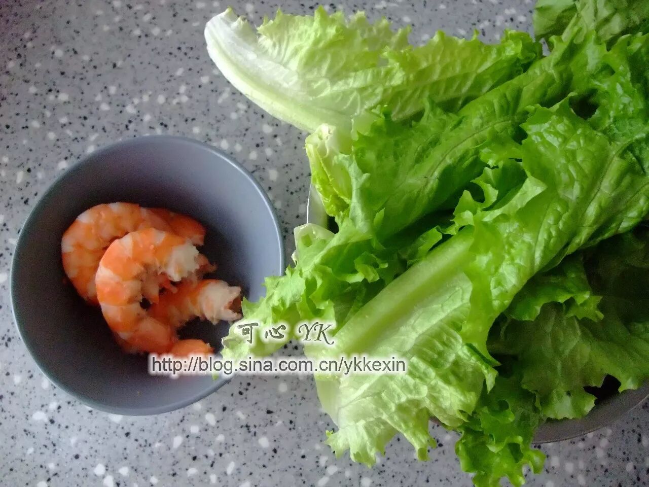 8/ 将生菜洗净、控干水份。虾加盐用水煮熟,去皮。