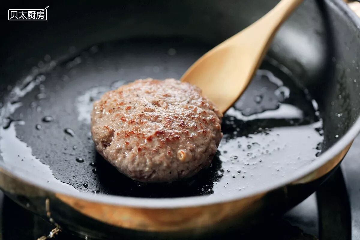 4/ 中火烧热锅中的油,待油温烧至7 成热时,放入已制好的牛肉饼煎熟。