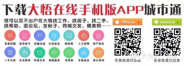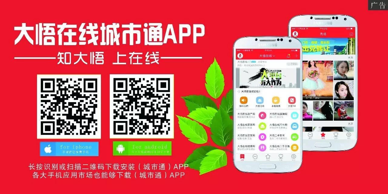 爆料投稿,寻人启事,爱心公益,公告声明,活动广告,招聘求职,房屋租售,门面转让,二手置换,车辆买卖,拼车顺风车,本地服务,招商加盟,招生培训,征婚交友,宠物信息,电话114,便民资讯等下载大悟在线(城市通)APP,图文信息免费发布浏览,一站式发布,全国显示!大悟在线-大悟综合信息门户网站,大悟资讯一网打尽!戳底部阅读原文,马上下载!