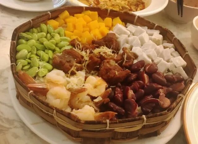 在糯米上铺了满满一层五谷杂粮和山珍海味,