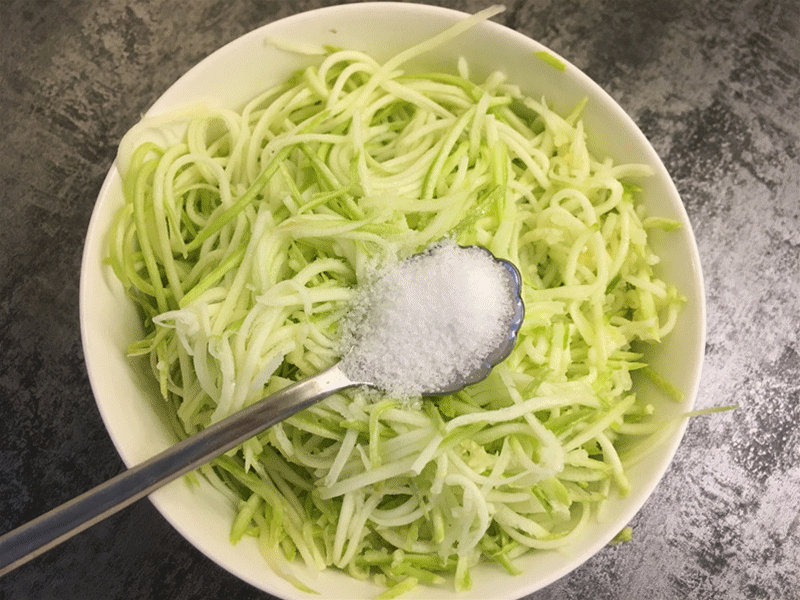 1. 西葫芦洗净连皮擦丝,加一小勺盐拌匀;