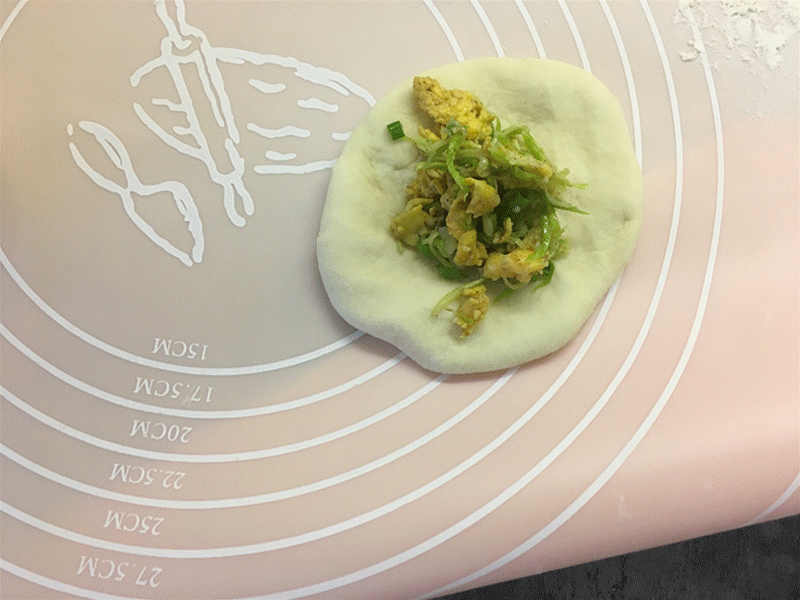 5. 取小面团压扁包入适量馅料,收口按扁;
