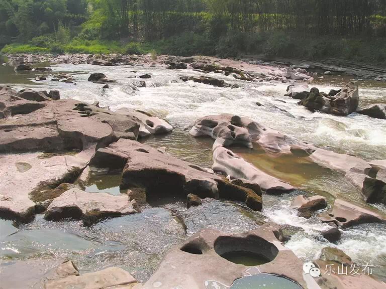 时值夏季,山洪正盛,冰臼景观自然难以一睹其全貌,但顺阶梯而下,石滩边若隐若现的部分冰臼,还是给人以极强的视觉冲击,为这一难得一见的神奇自然景观所吸引、所赞叹。
