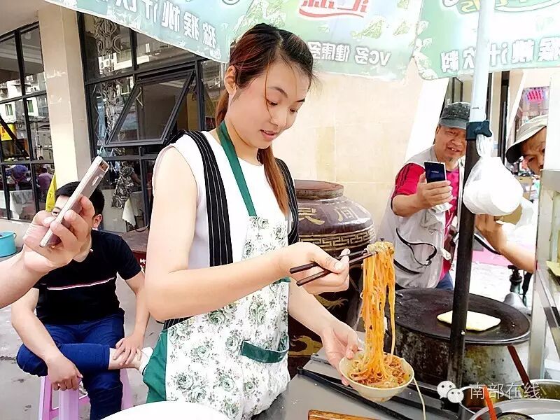 原标题:“锅盔西施”人美锅盔好 打起拥堂来吃锅盔夹凉粉的 专程来看美女的 络绎不绝