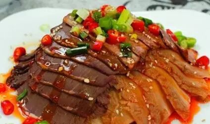 成都地区人人皆知的一款风味名菜。相传在30年代,成都少城附近,有一男子名郭朝华,与其妻一道以制售凉拌牛肺片为业,他们夫妻俩亲自操作,走街串巷,提篮叫卖。由于他们经营的凉拌肺片制作精细,风味独特,深受人们喜爱。为区别一般肺片摊店,人们称他们为"夫妻肺片"。设店经营后,在用料上更为讲究,以牛肉、心、舌、肚、头皮等取代最初单一的肺,质量日益提高。为了保持此菜的原有风味,"夫妻肺片"之名一直沿用至今。