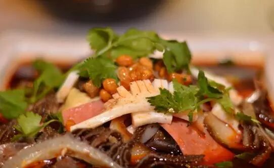 凉拌肺片、五香蹄筋等多种凉菜。吃二姐兔丁,第一先吃的一定是脆脆的花仁,然后是兔子,最后是葱头。