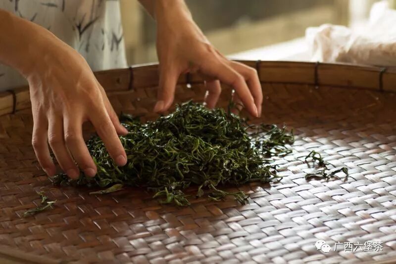 原料,经杀青、揉捻、渥堆、复揉、干燥制成为六堡毛茶,如果再筛分、压