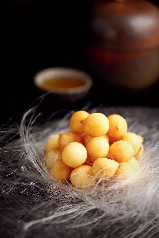 蜜汁葫芦,在一个外行人眼里就是一道形似精致西点、吃完可灭西点卵磷脂魔术的纯中式白案绝活儿。烫面加鸡蛋调成硬糊,再简单不过了吧,不过比例多少厨师秘而不透,总之要硬到左手攥一个面球的瞬间,用右手一捅就做成一个空心薄皮的汽球,下锅油炸成浑圆金黄、大小如鹌鹑蛋,再捞出拔丝。偷懒的做法可以淋上蜂蜜慢慢吃,不过吃拔丝的才有又烫又香又是惊喜的圆满。
