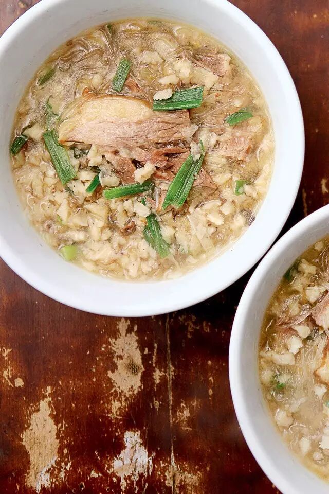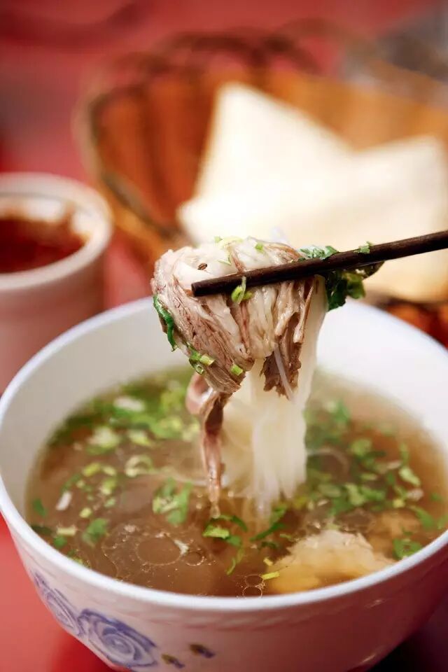 讲究的羊肉泡馍字号,馍都是自家烤制的。而掰馍,又是个考验耐心的慢活儿。一流的泡馍,真正要掰到蜜蜂头大小,才能五味尽得。要碗“水围城”,将馍、粉丝一起放在锅里,加入带皮、肥瘦相间的羊肉片,用熬好的羊肉汤大火煮出浓香,出锅前点少量明油(用花椒熬好的羊油),即盛入碗中。这一碗绝对颠覆你以往印象的泡馍:汤清而不油,粉丝莹亮,上面爬满了“蜂头”,每一粒都吸饱了汤汁,玉润略带一点嚼劲,羊肉软烂鲜香,粉丝适口充肠。吃的时候尽着一边吃,保证鲜热之气不散。一鼓作气,觉得整个人都要跌入一碗羊肉泡馍的醉漾了。