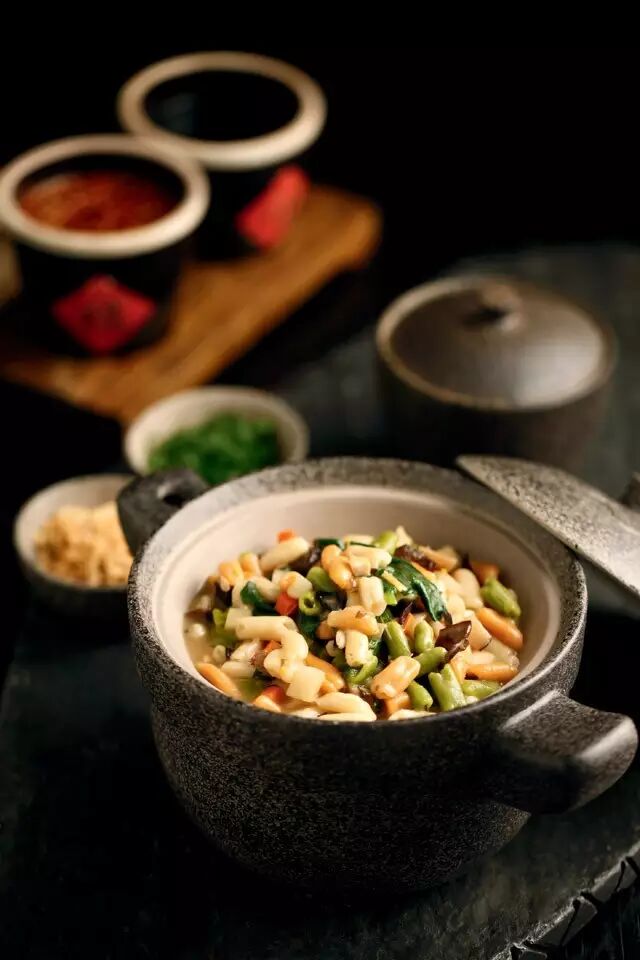 麻食是以荞面为原料,搓成细长条,再掐成指肚大小的面卷。大小如小指肚的麻食煮熟后,干盛半碗,再浇上用上好的羊肉煮的汤,里面可放羊肉、木耳、黄花、蔬菜等,汤鲜面滑,在舌间粒粒有一兜汤,吃起来无比温润,在酒后或者早上烫烫地来一碗,都能好吃到让人瞬间醒来。吃麻食,得加一点麻叶,即面粉加鸡蛋跟油和好,擀薄,切成菱形块,炸至酥脆,有点像北京的薄脆。
