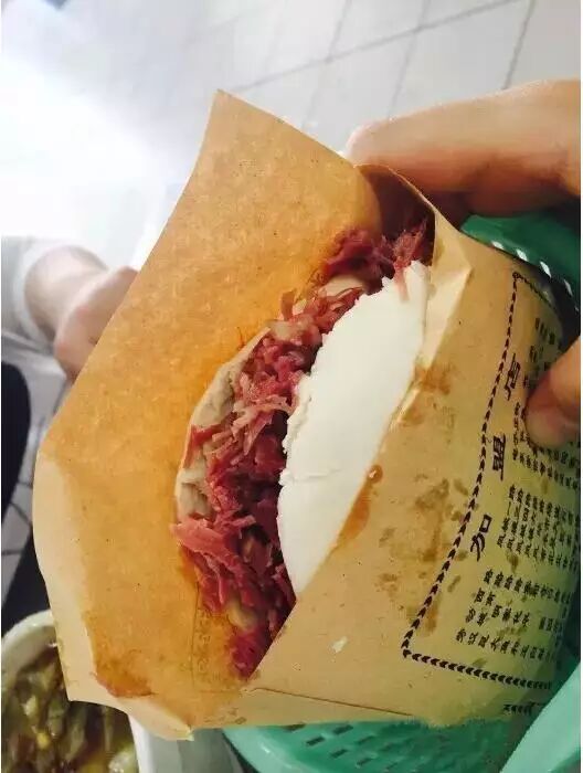 腊牛肉夹馍是回民的肉夹馍,一般作早餐吃,其标配是回民的肉丸糊辣汤。但记得一定要热馍夹凉肉,不然就是一嘴的油腥味儿,这是检验是否是真正吃货的标准之一。