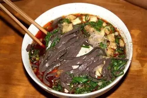粉汤羊血是陕西地区传统名吃之一,由制血、配调料和泡馍三个步骤精制而成。食时配以粉丝、香菜等辅料。羊血鲜嫩、粉丝光滑筋软、辣香扑鼻,寒冬食用为最佳。
