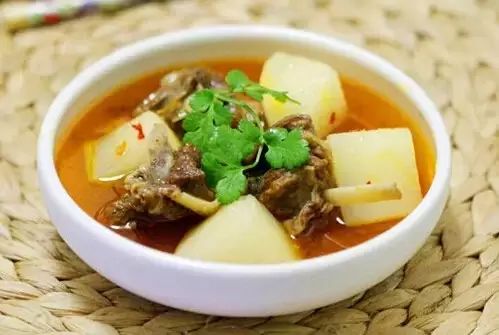 5、待羊肉8分熟的时候,放萝卜炖至变软入味,加鸡精、盐,撒香菜
