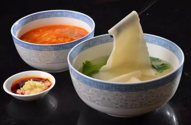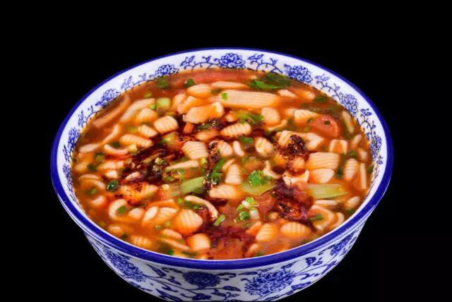 在陕西,尤其以杨凌蘸水面出名。有道是“面白薄筋光,汤汪蒜辣香,汤面分盆装,越嚼越觉香。”蘸水面是论根卖的,每根面宽四、五厘米,长一米左右,一根面足有二两重。店家煮好面后会用大盆装起来供众人分食。