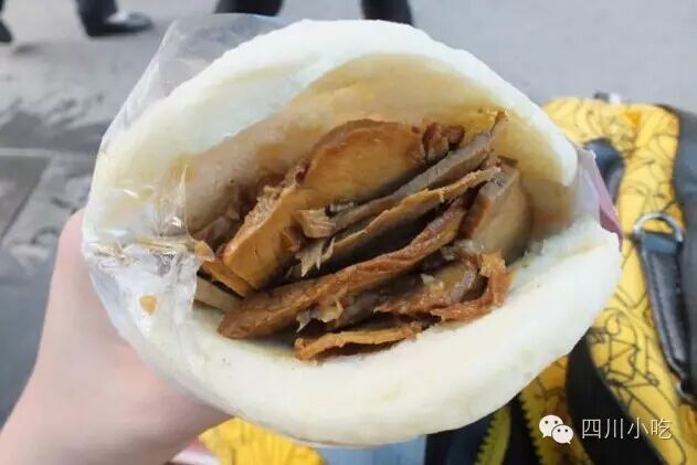 卤肉锅魁,有点象是北方的烧饼,四川人发明了夹肉、夹菜法。也有以糖作馅儿的,就是糖饼。四川人给它起了个特别的名字,所以显得不同。四川堪称锅魁王国,各地城乡随处可见,不分雅俗人人都吃,特别是以前自贡6中门口的那家。八味别上看,四川锅魁品种繁多,有甜、咸、白味、五香等;从用料上看,则有芝麻、椒盐、葱油、红糖、鲜肉等等;从制作方法看,又有包酥、抓酥(抹酥、炒酥)、空心、油旋、混糖等等。单是成都地区常见的品种就有三十多个。街头巷尾的小吃摊上多有出售;名小吃店内有它的地位;甚至高级筵席上也能见到它的踪影。有以此为早点的,有用它打尖的,有以它配食风味菜点的,总之喜食者众。吃肥肠粉就的配上它,一口粉一口锅魁,满足啊,或者撕成小块,泡在汤裏也很不错,味道交融。锅魁的制法较多,可以分为包酥、抓酥、空心、油旋子、包馅等。