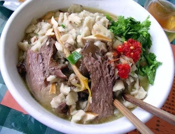 将大肉切成一大块、一大块的,放在锅里炖,炖的烂烂的,加入辣椒、调料等多种辅助品,还可以放一点儿饺子,煮成一大锅肉汤,汤特别的辣!然后根据自己的饭量可以拿一个饼或者两个、三个,吃的时候,自己根据爱好将馍掰成一块一块的,放在一个大碗里交给厨师~