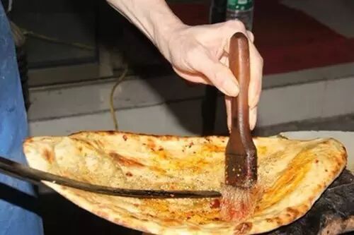 锅盔熟了,是不是也要赤手“火中取盔”呢?这时候就需要用到一个工具了。这是一把长长的铁钳,和给煤炉子换煤的火钳类似,但是更长、更扁,而且为了配合炉内的弧度,钳身是弯的。师傅微斜着身子,头朝后偏着,好窥到内炉的锅盔的样子。判断出哪个已经熟了,就用铁钳夹住锅盔的边缘,轻轻撬起一角,再小心地整张揭下,另一只手拿刷子沾上油,在锅盔上迅速地一刷,马上伸进炉内烘片刻。稍顷拿出来时,就正式出炉了!接下来师傅会问要不要刷辣。辣分为两种,一种是油辣子,一种是辣椒酱,本地人一般都会刷上一点。刷完以后,要么按要求三两下用刀给你切成小块,要么就拦腰一折,装在特制的纸袋里递给你。现在,你绝对会忍不住马上一口就咬下去!外壳酥脆、肉馅香浓、芝麻喷香,丰富的口感一股脑地钻进口腔,鼻子也要一同帮忙,“呼儿呼儿”地往外吐气——实在太烫了!
