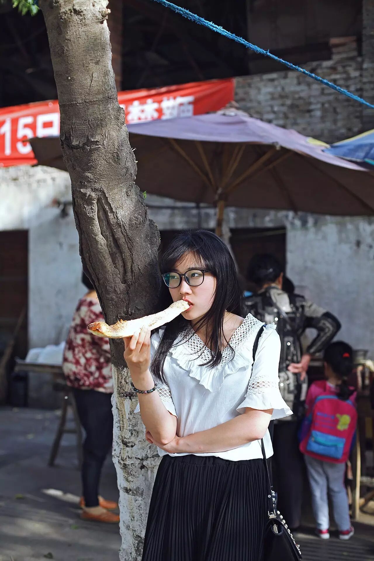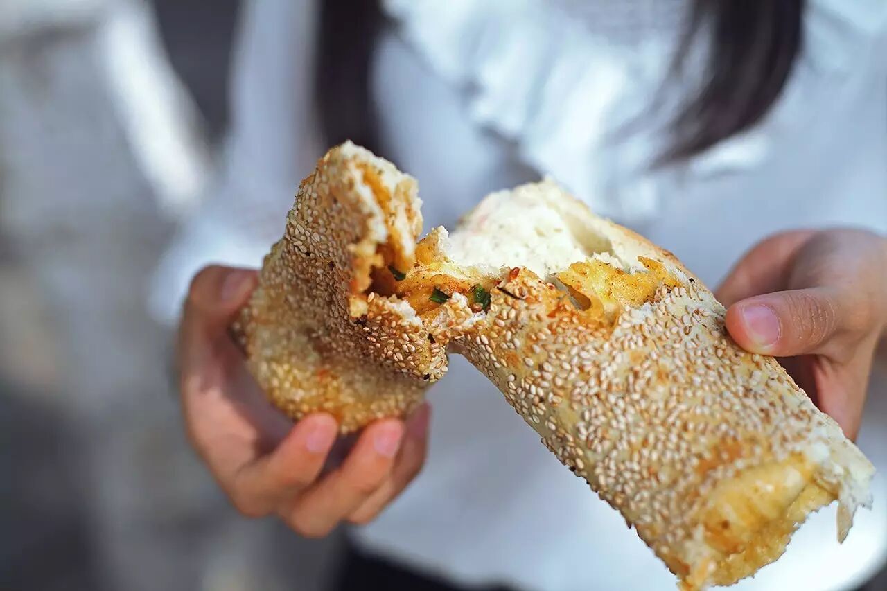 锅盔包油条,又香又有嚼劲,但是牙齿不好的人不要轻易尝试喔。里面没有馅的大锅盔,我们会自己沾着豆豉吃,这是小时候最原始的吃法。