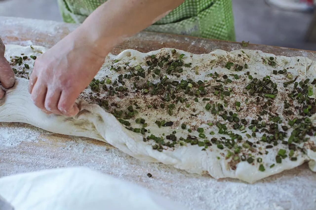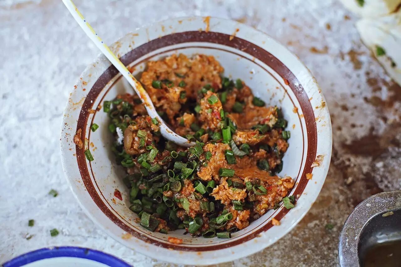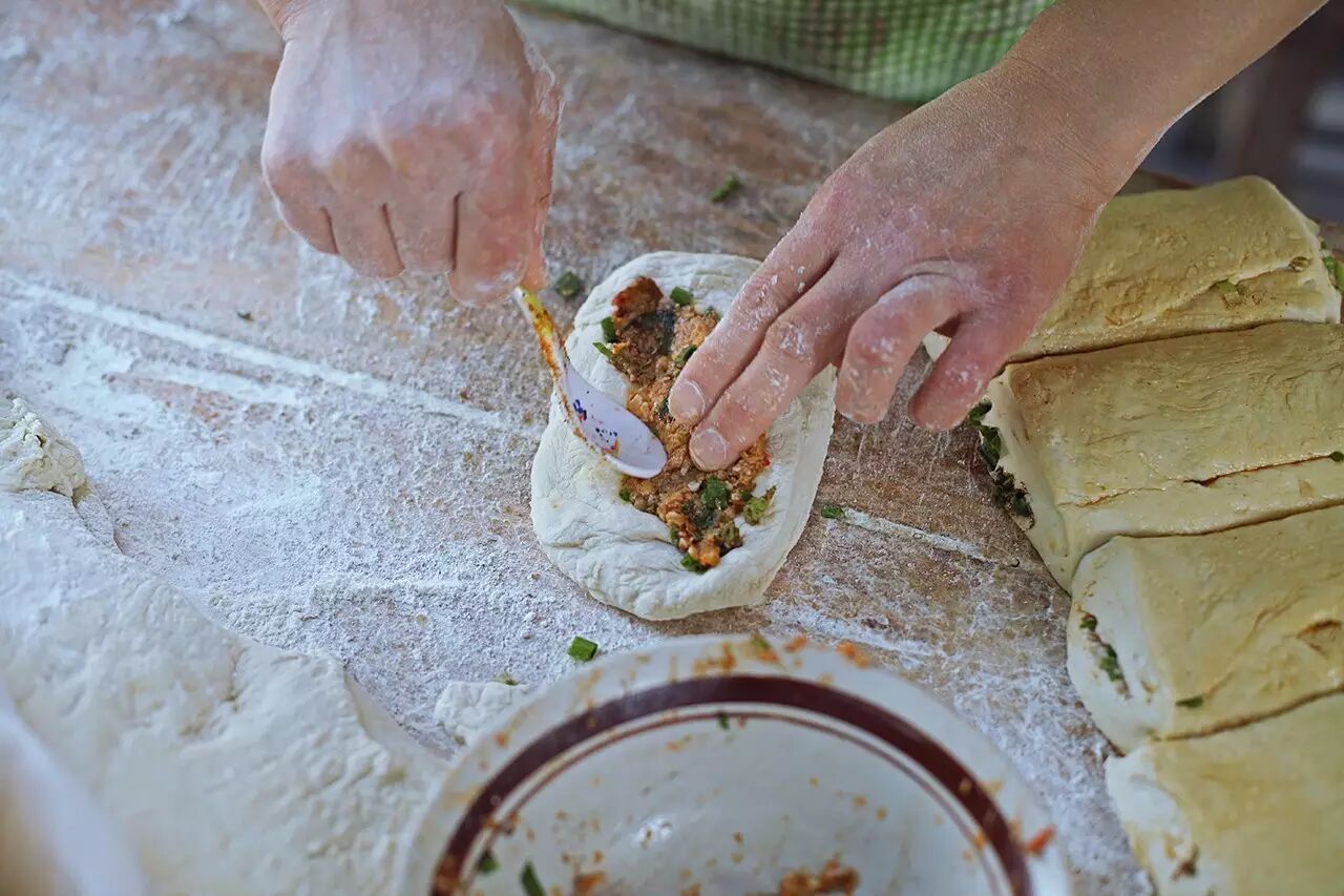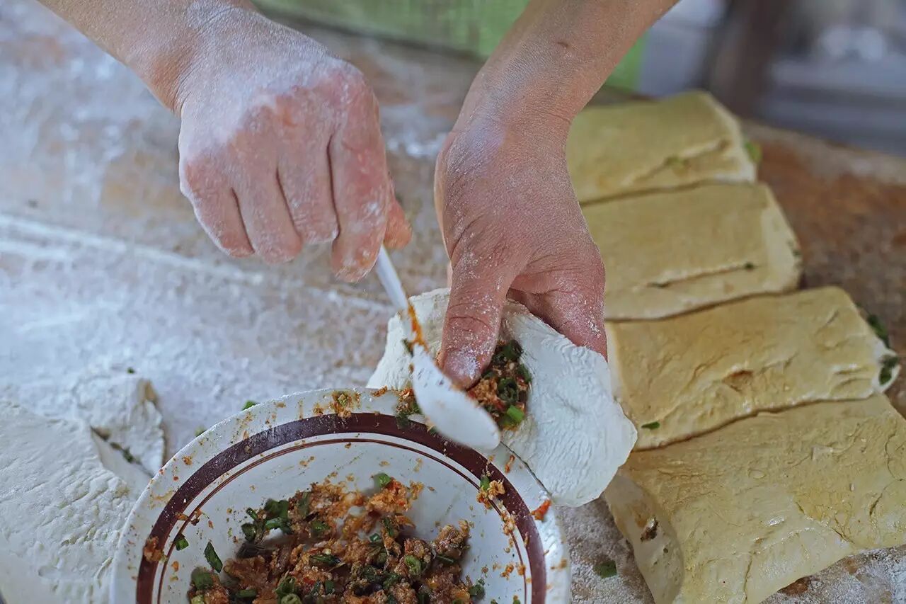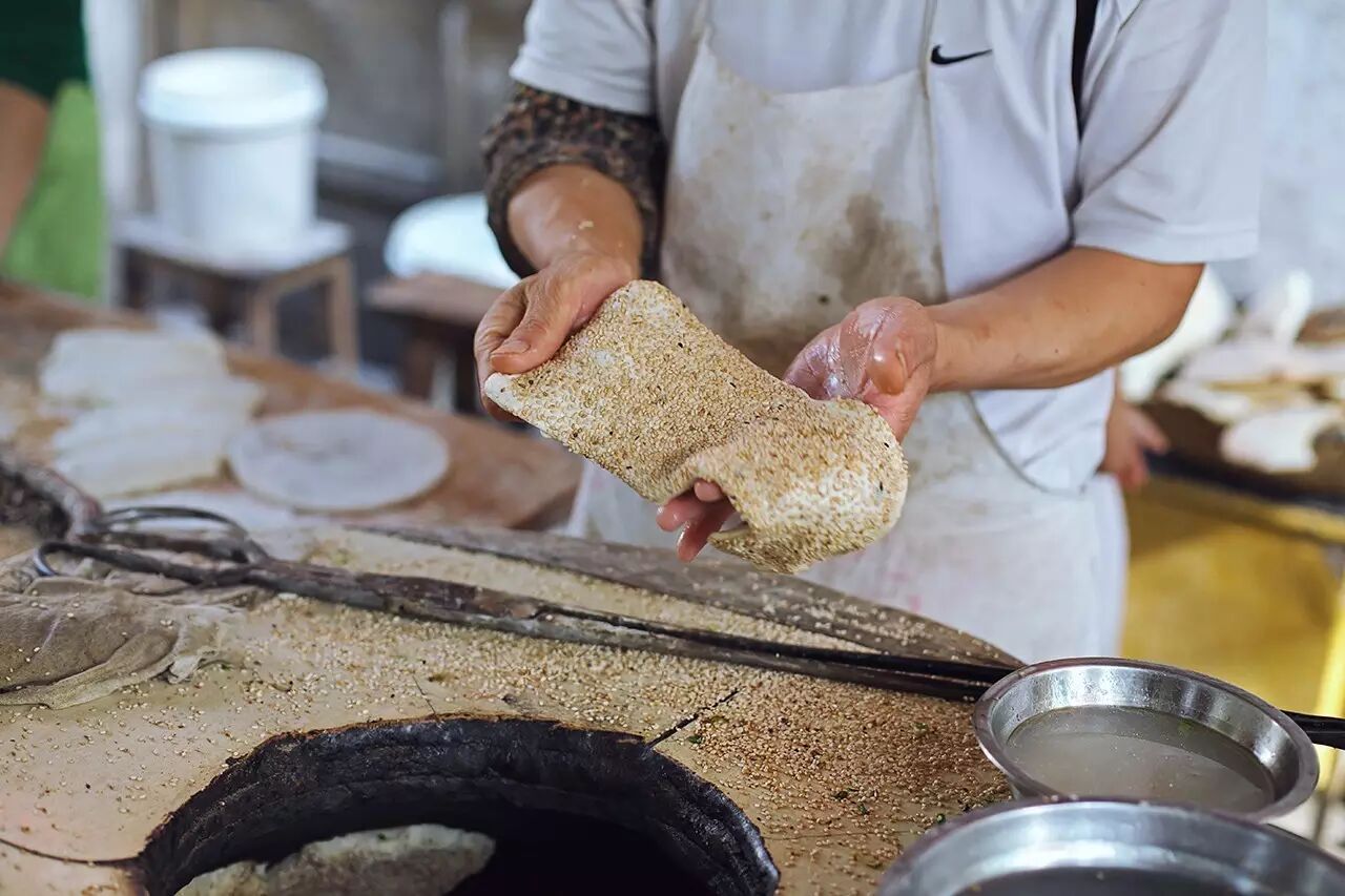 另一个人根据顾客的需要,有的不加馅,只加一点葱和五香粉,这种锅盔叫”土锅盔“或”五香锅盔“。有的加豆豉和肉末的是”小锅盔“。然后将捏好的面团三下两下,抻宽拉长,有的做成鞋底样,有的做的像月亮,最后沾上芝麻。