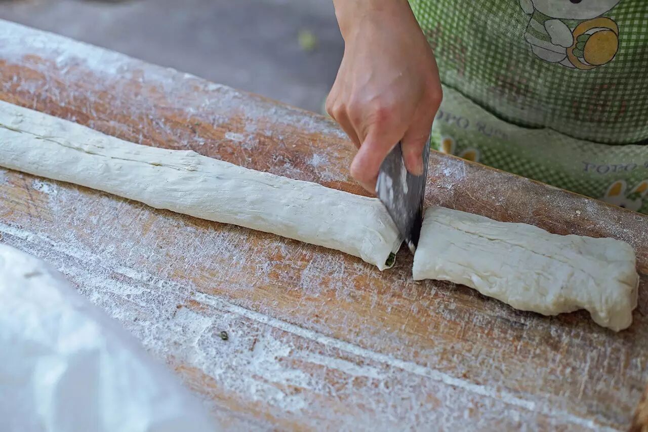 锅盔,一种烤制的面食。制作锅盔一般是两个人,一人负责在案板上揉面,然后将一团团发酵的面揉捏成长条形。