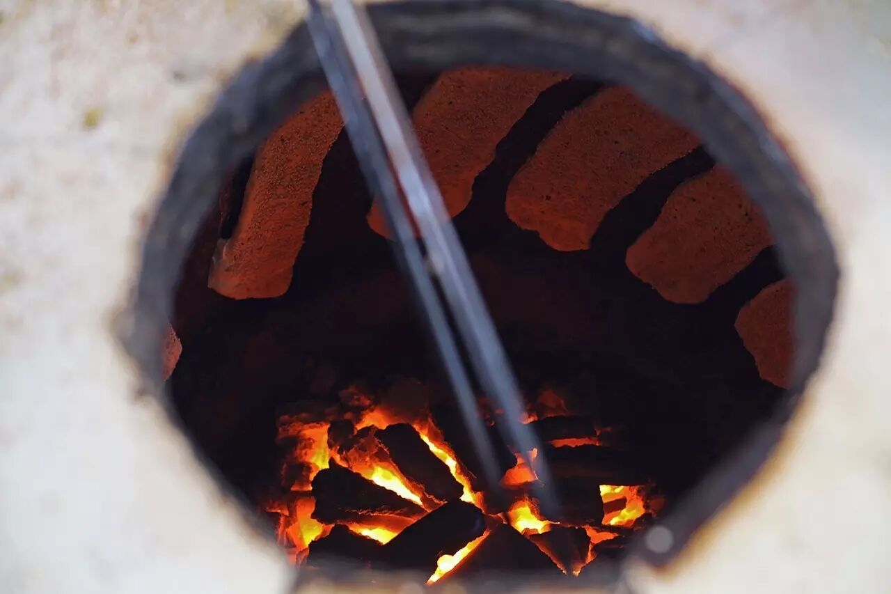 这一切在三两分钟完成,锅盔师傅便将面食迅速贴进了炉膛里。炉膛里还燃着一盆隐约可见的的火,或者是木炭,或者是无烟煤,这是烤制锅盔的唯一能源。
